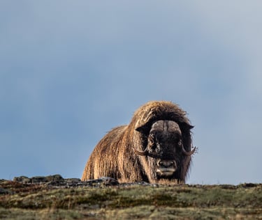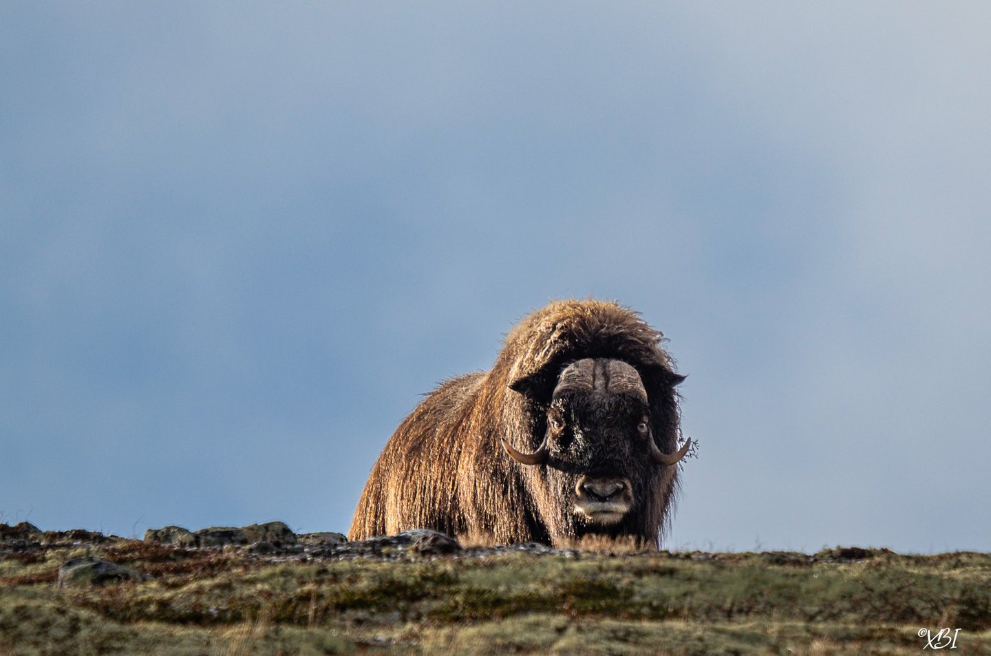 Les boeufs musqués ont été réintroduits en Norvège sur les hauts plateaux du Dovrefjell dans les années 50 à 70. A part au Groenland, c'est le seul endroit d'Europe où on peut les observer à l'état sauvage. Je ne voulais pas prendre de guide, j'ai mis 4 jours avant de les trouver. Cet animal préhistorique, bien que débonnaire et grégaire, peut vous charger à du 60 km/h, s'il se sent en danger. La règle est de ne pas les approcher à moins de 200 m.